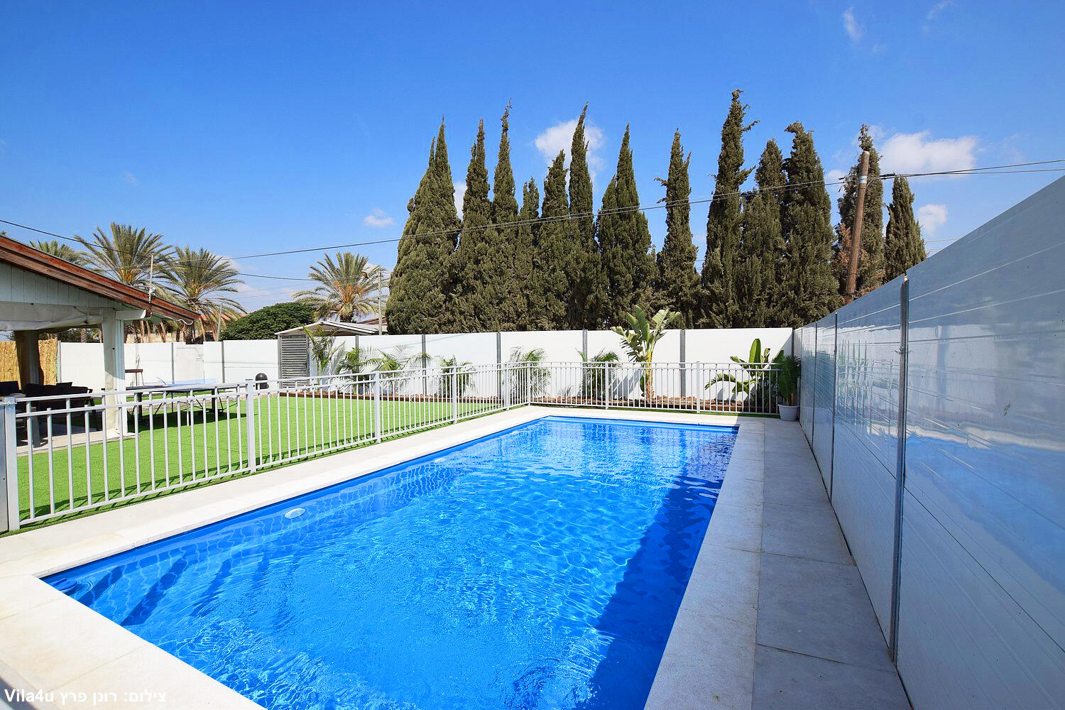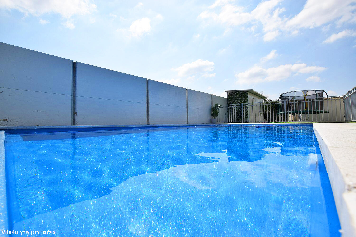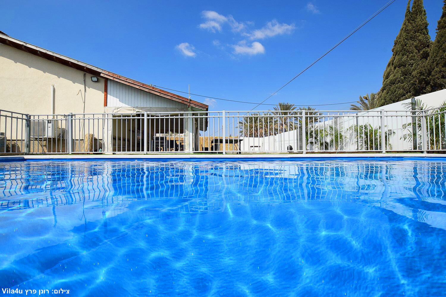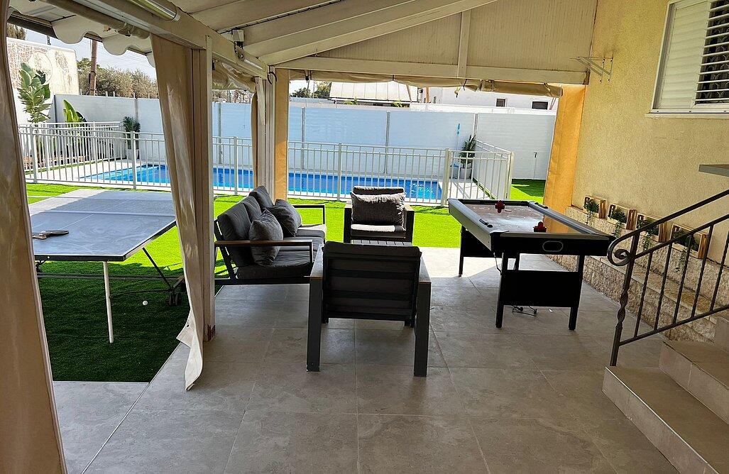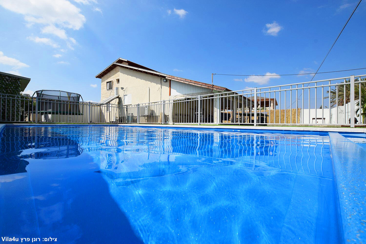 באחוזה 4 חדרי שינה מרווחים עם מיטות יהודיות ומיזוג בכל חדר, הסלון המואר כולל מסך LCD ופינת אוכל רחבה מושלם לארוחות משפחתיות משותפות, המטבח מצויד במלואו - מקרר, תנור, כיריים, מיקרוגל, מתקן מים לשבת וכלי הגשה, בחצר מחכה לכם בריכת שחייה גדולה, מדשאות ירוקות וטרמפולינה מהנה לילדים.