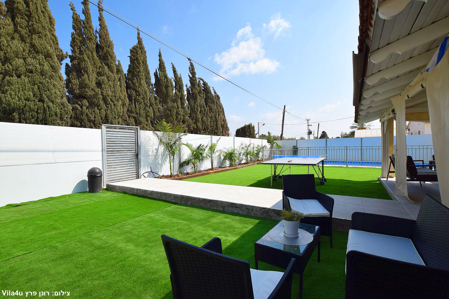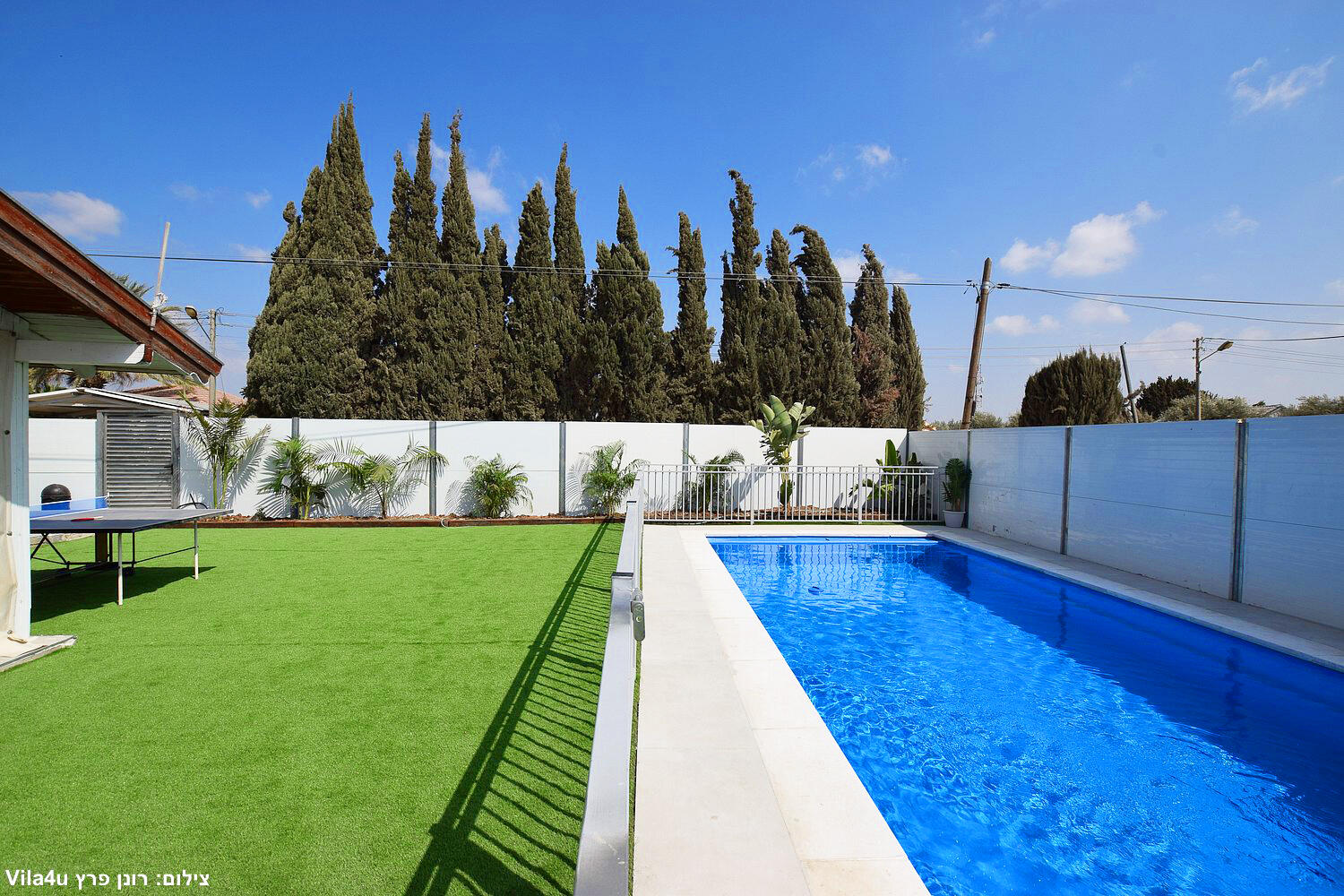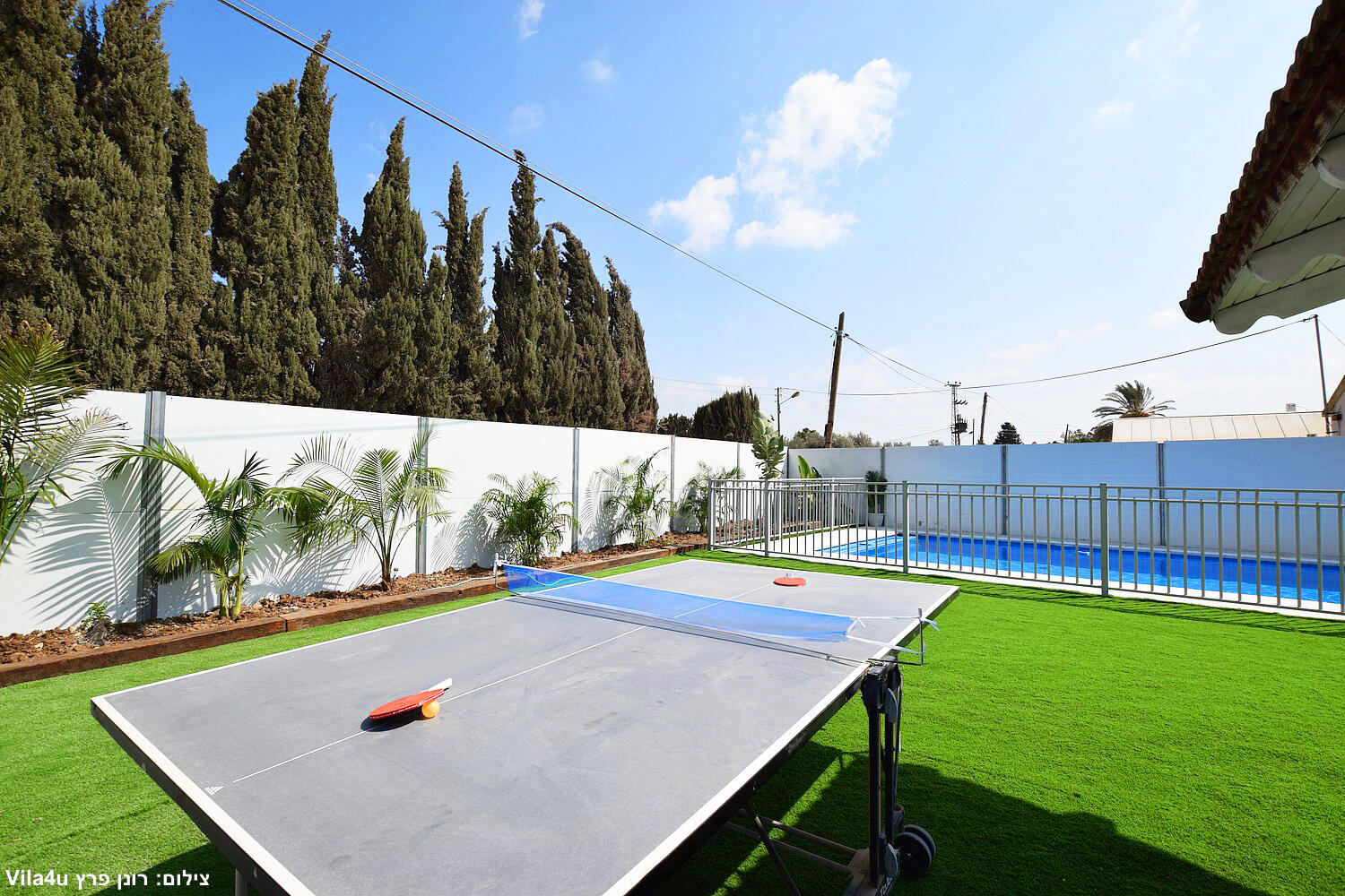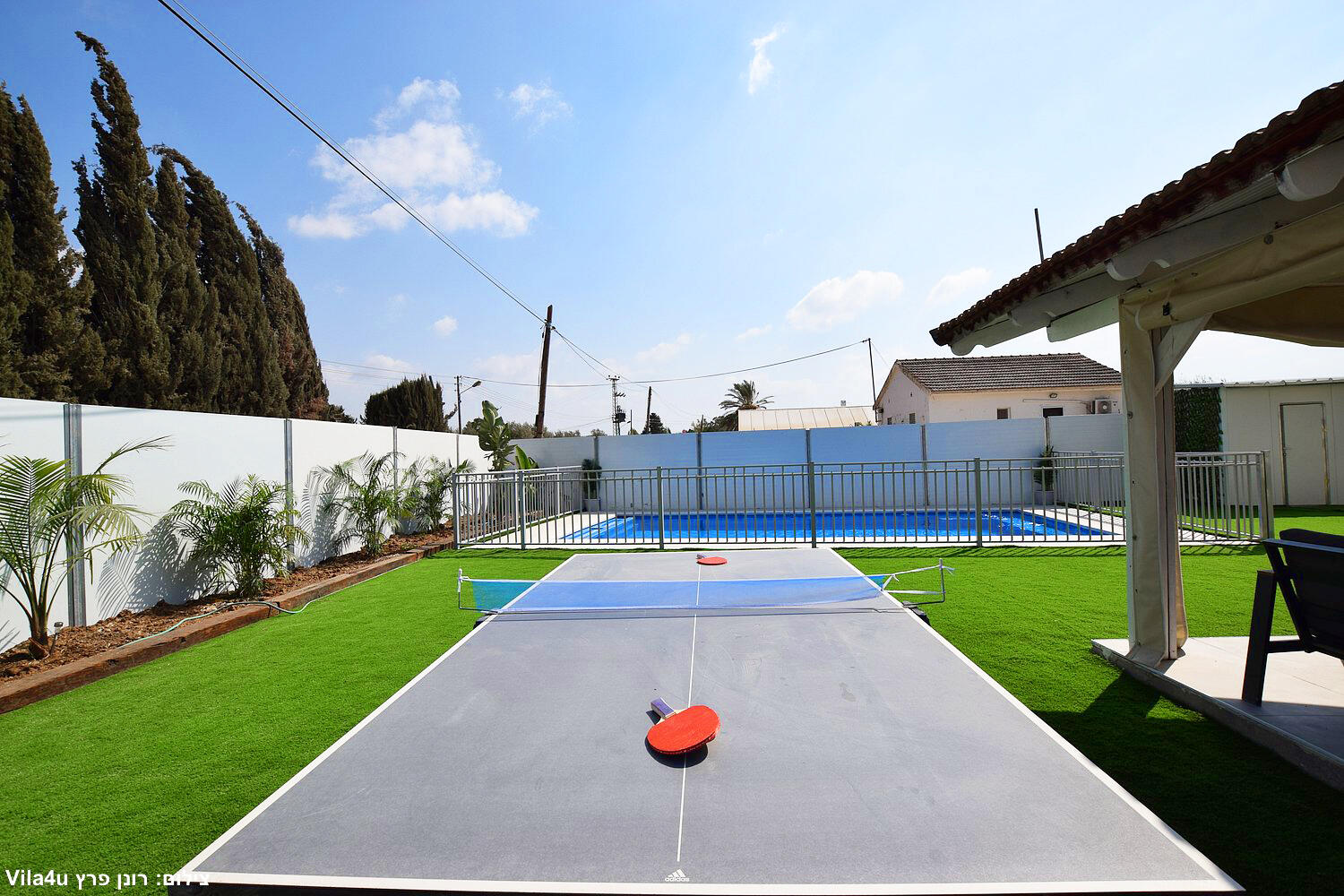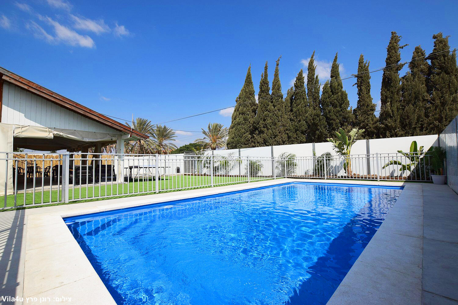 באחוזה 4 חדרי שינה מרווחים עם מיטות יהודיות ומיזוג בכל חדר, הסלון המואר כולל מסך LCD ופינת אוכל רחבה מושלם לארוחות משפחתיות משותפות, המטבח מצויד במלואו - מקרר, תנור, כיריים, מיקרוגל, מתקן מים לשבת וכלי הגשה, בחצר מחכה לכם בריכת שחייה גדולה, מדשאות ירוקות וטרמפולינה מהנה לילדים.