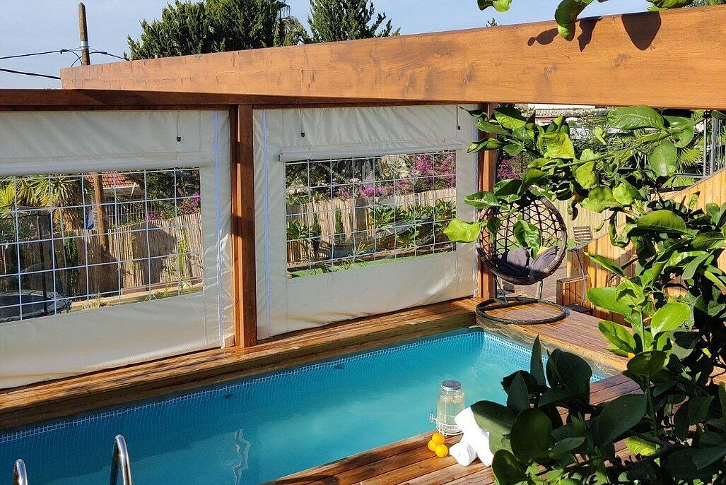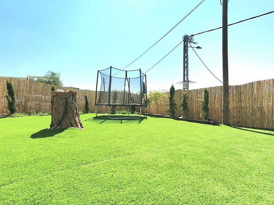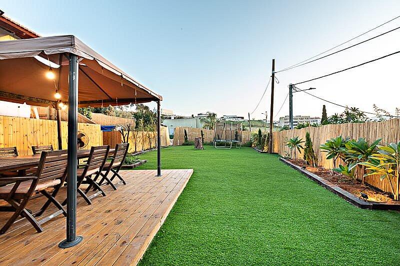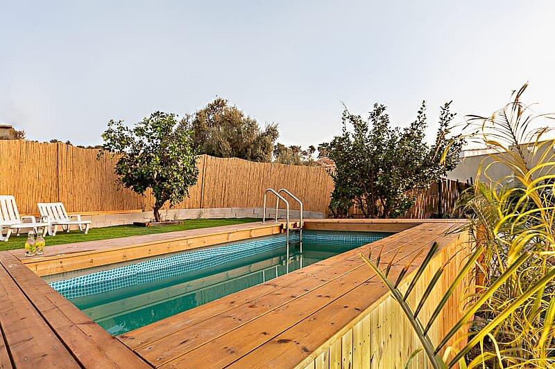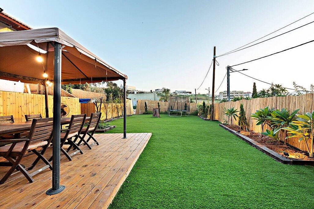 בריכה מחוממת, עצי פרי, טרמפולינה לילדים וחללים נעימים לנשימה.